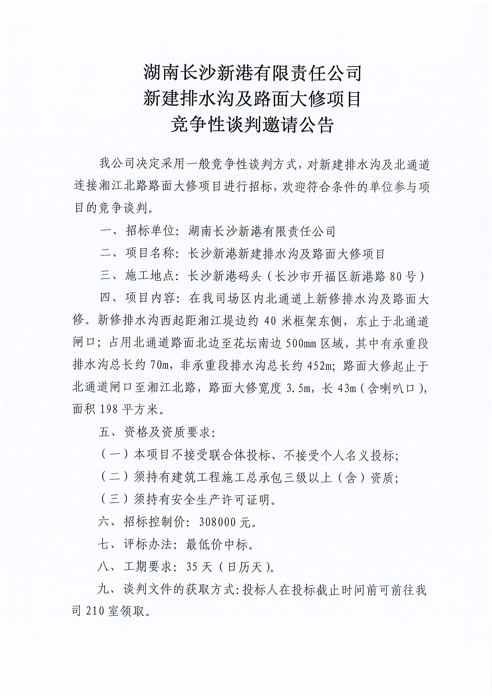 湖南長沙新港有限責任公司 新建排水溝及路面大修項目競爭性談判邀請公告