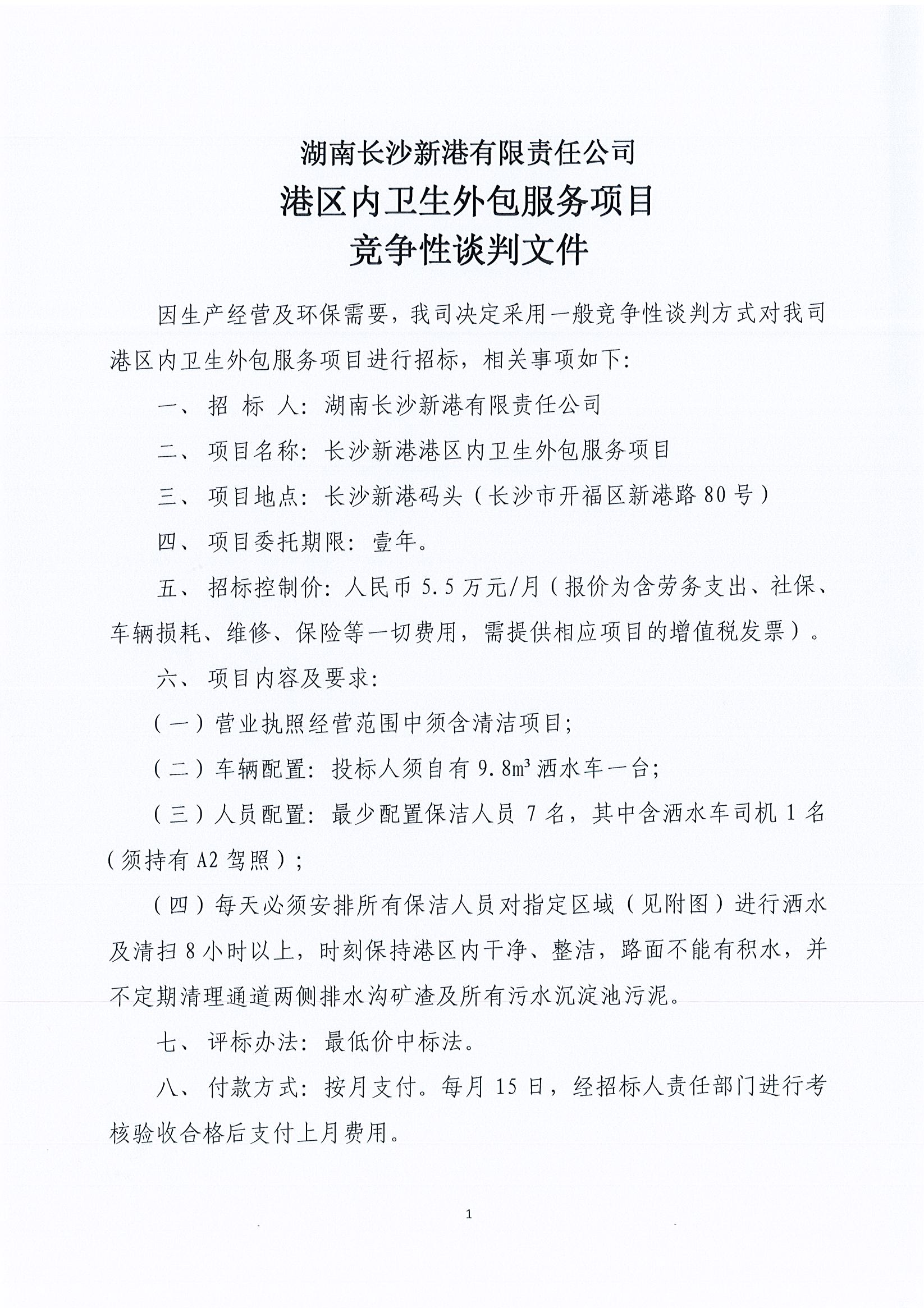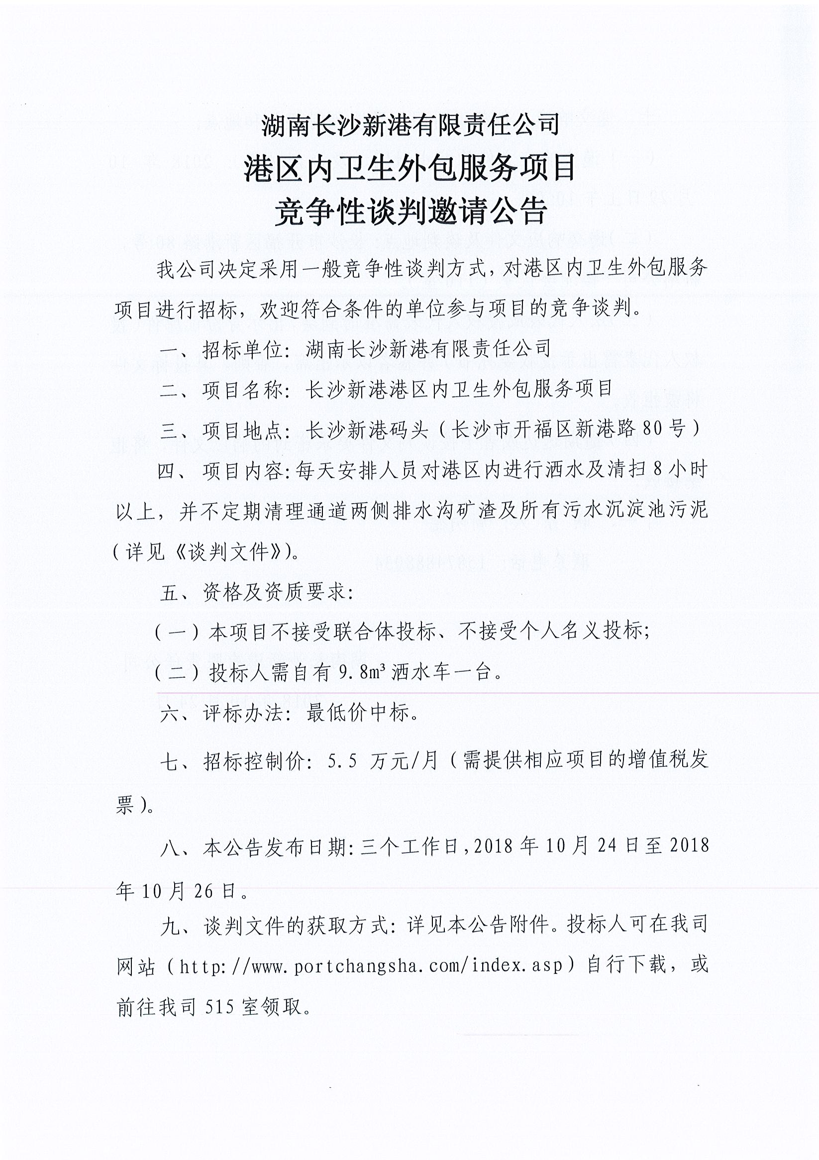 湖南長沙新港有限責(zé)任公司 港區(qū)內(nèi)衛(wèi)生外包服務(wù)競爭性談判邀請公告