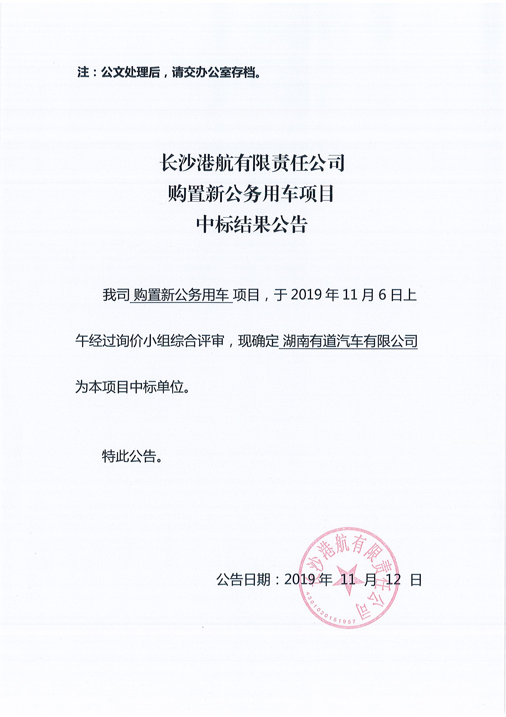 長(zhǎng)沙港航有限責(zé)任公司購(gòu)置新公務(wù)用車項(xiàng)目中標(biāo)結(jié)果公告