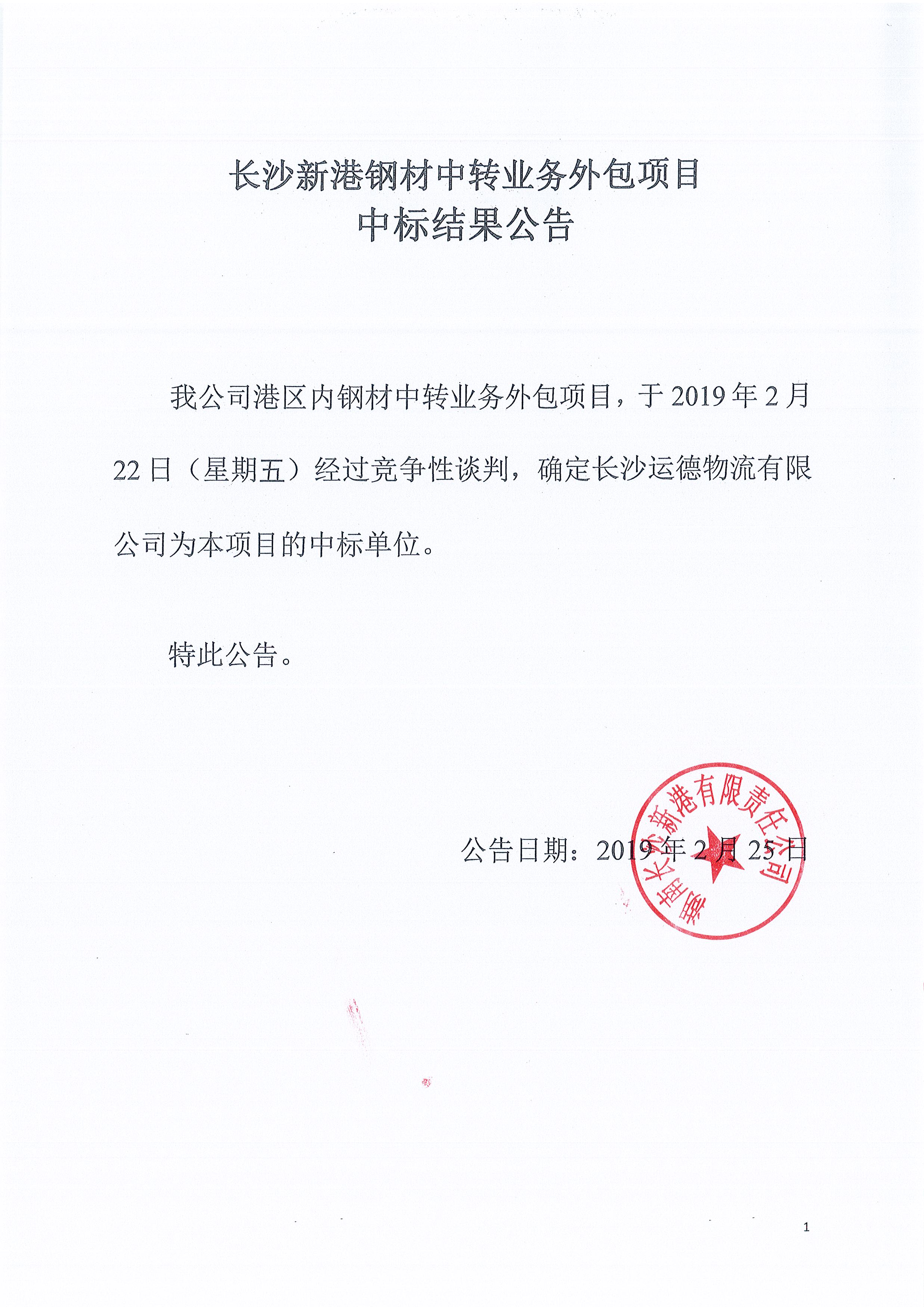 長沙新港鋼材中轉(zhuǎn)業(yè)務(wù)外包項目中標(biāo)結(jié)果公告