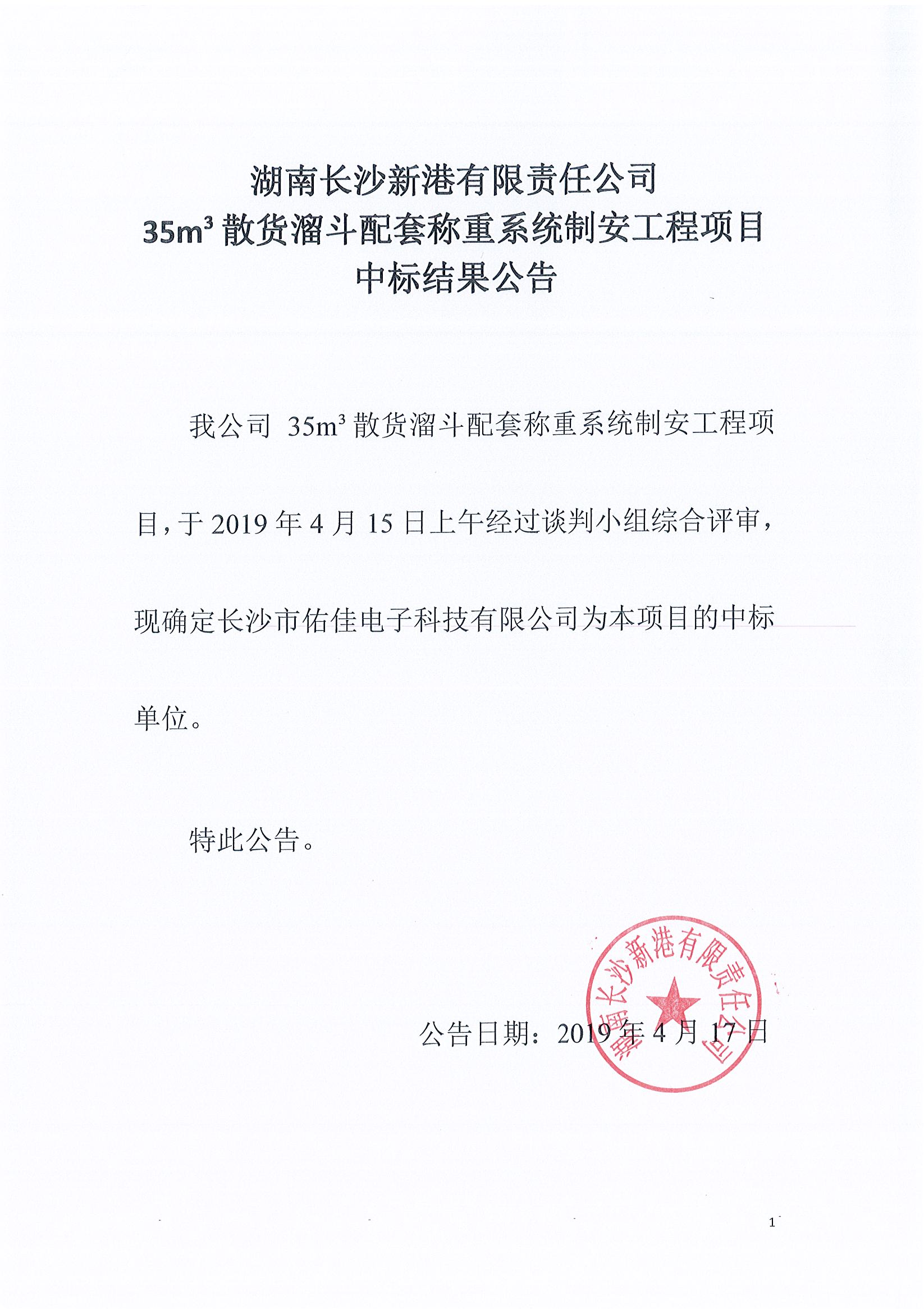 湖南長沙新港有限責(zé)任公司35m³散貨溜斗配套稱重系統(tǒng)制安工程項目中標(biāo)結(jié)果公告