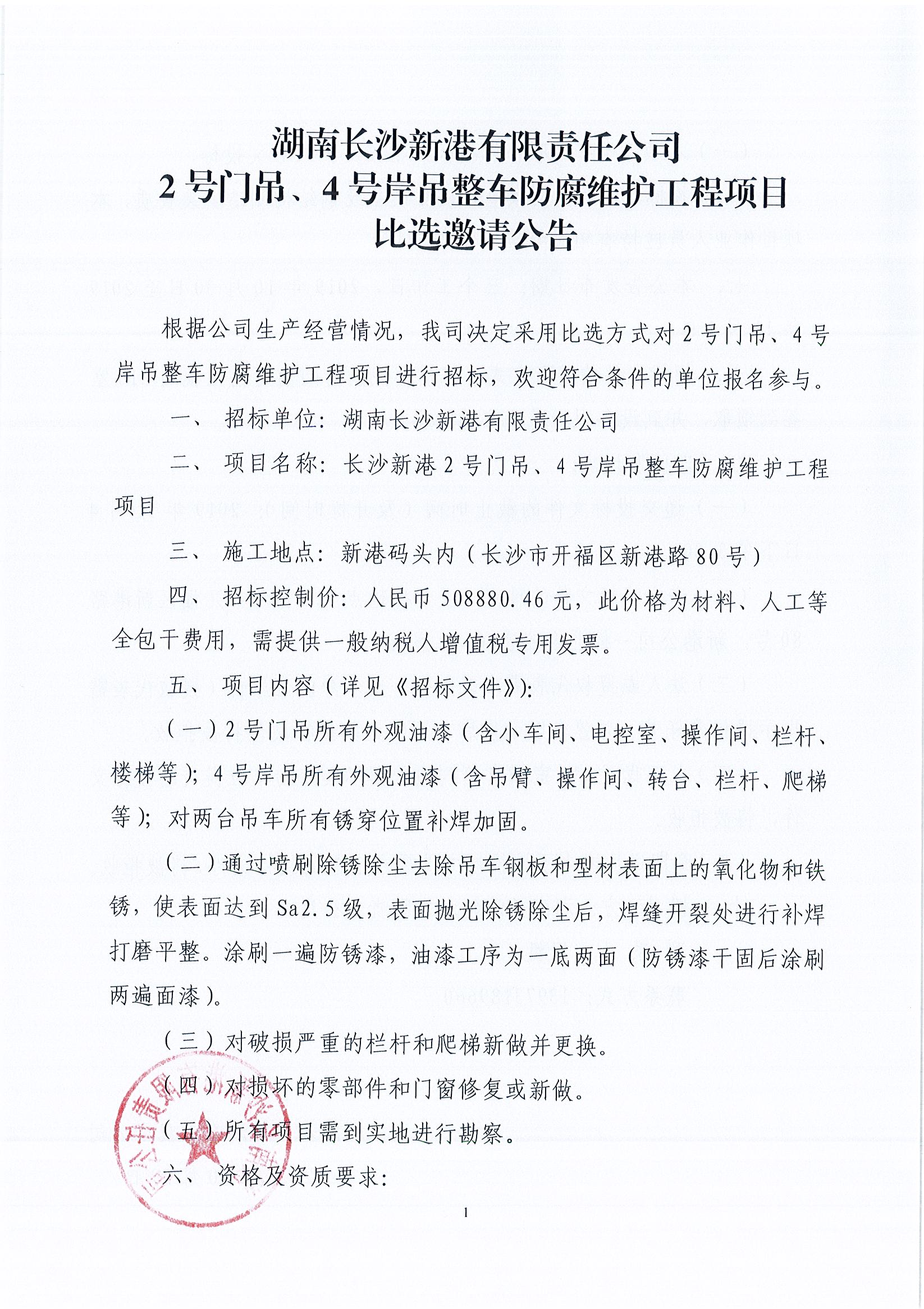 湖南長沙新港有限責(zé)任公司2號(hào)門吊、4號(hào)岸吊整車防腐維護(hù)工程項(xiàng)目比選邀請公示