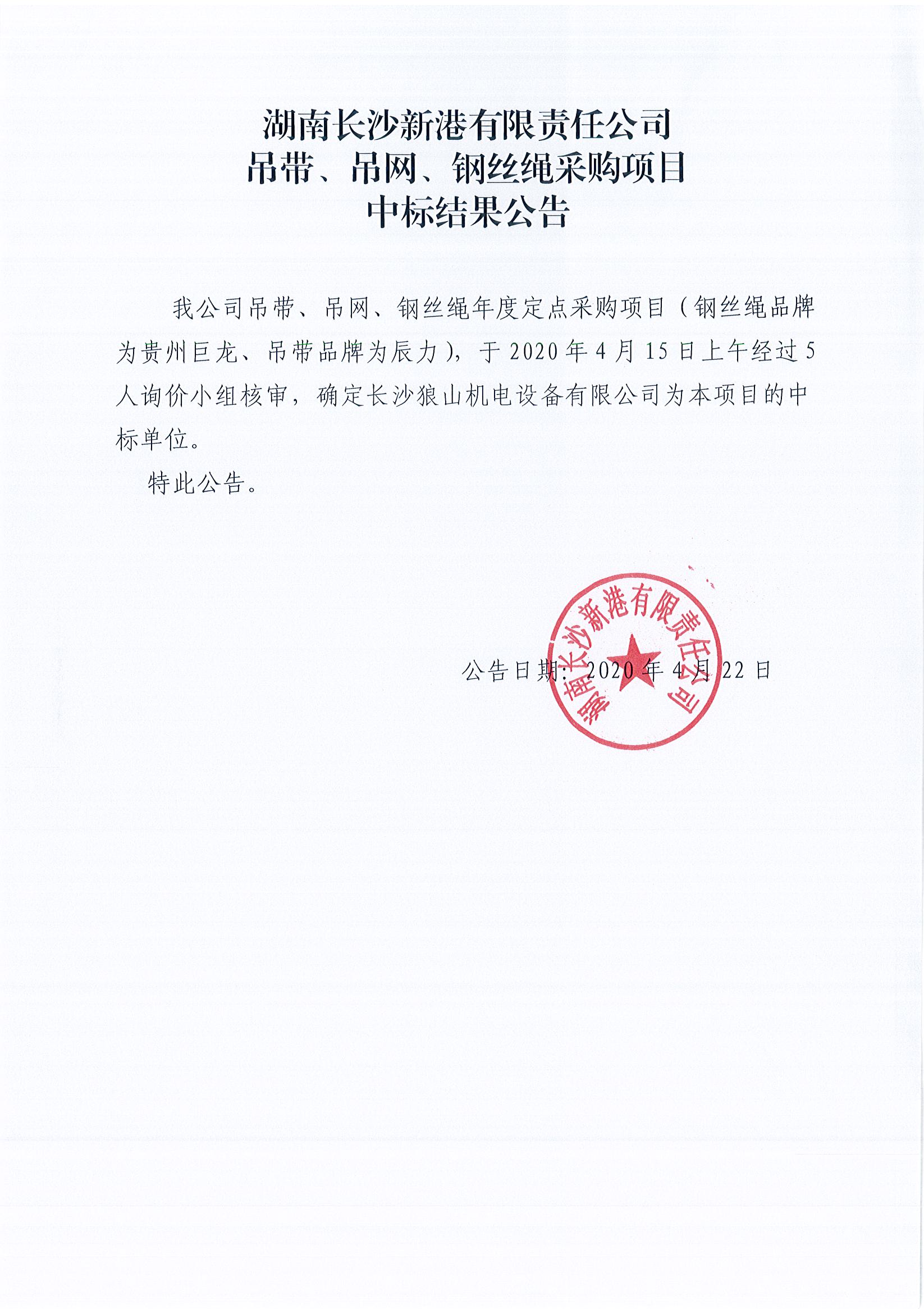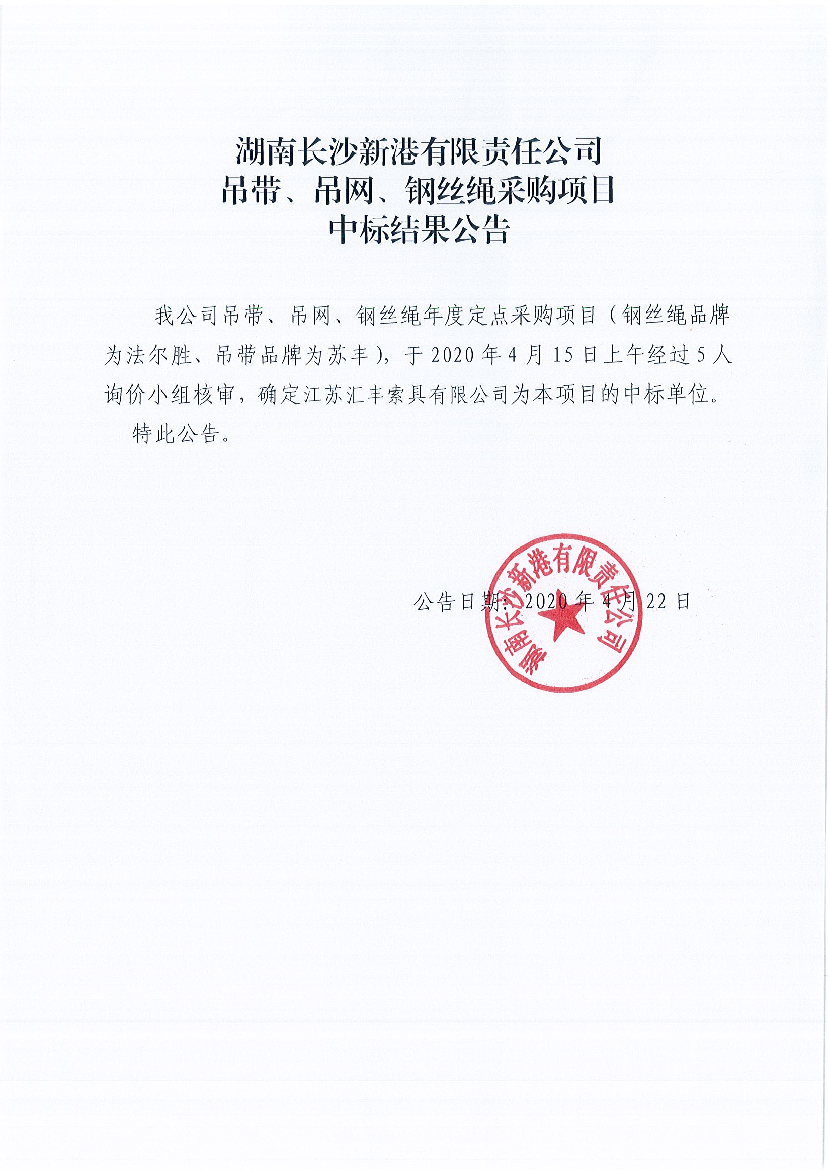 湖南長沙新港有限責(zé)任公司吊帶、吊網(wǎng)、鋼絲繩采購項目中標(biāo)結(jié)果公告