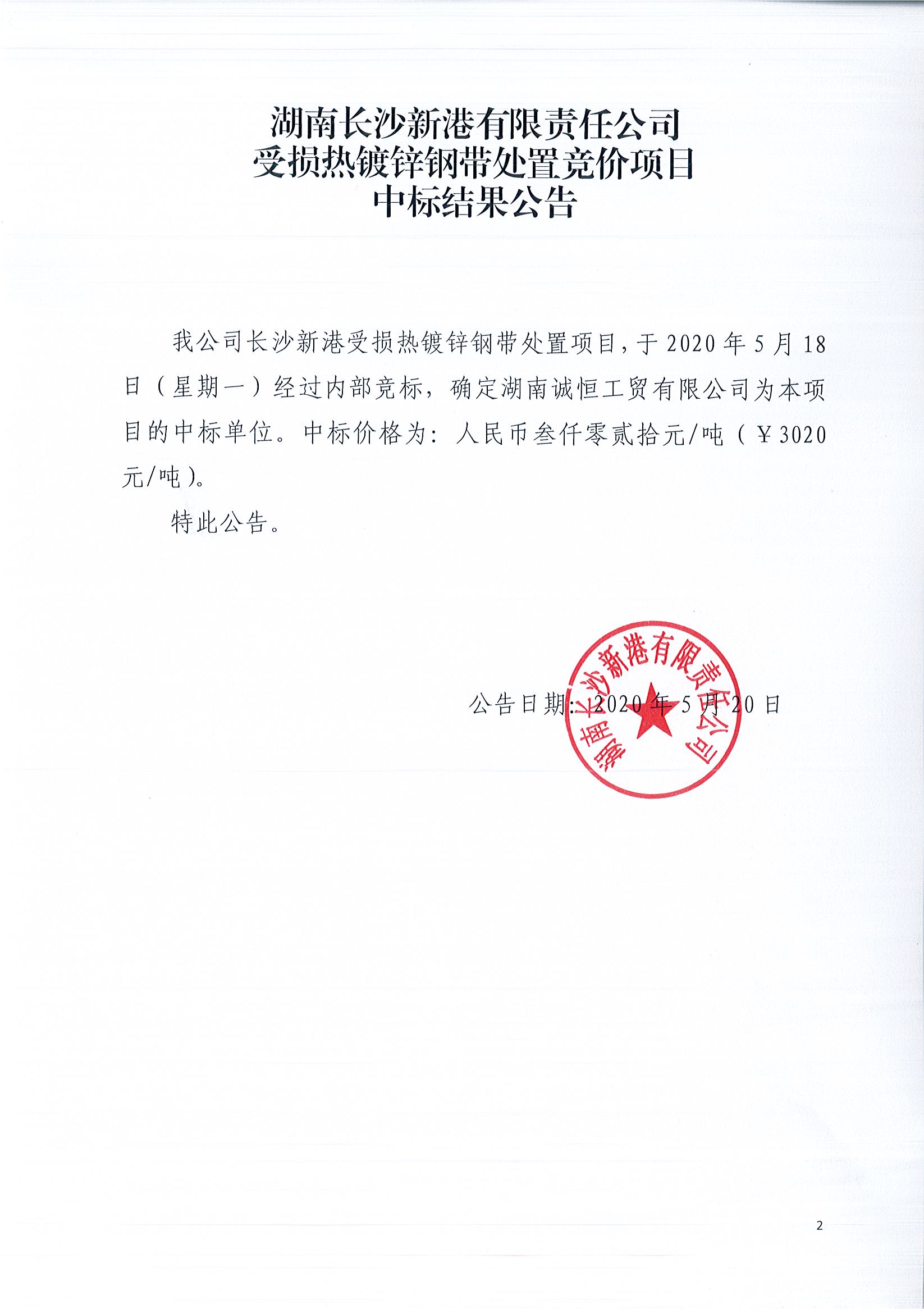 湖南長沙新港有限責(zé)任公司受損熱鍍鋅鋼帶處置競價項目中標(biāo)結(jié)果公告